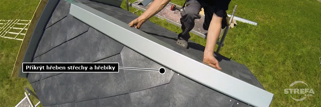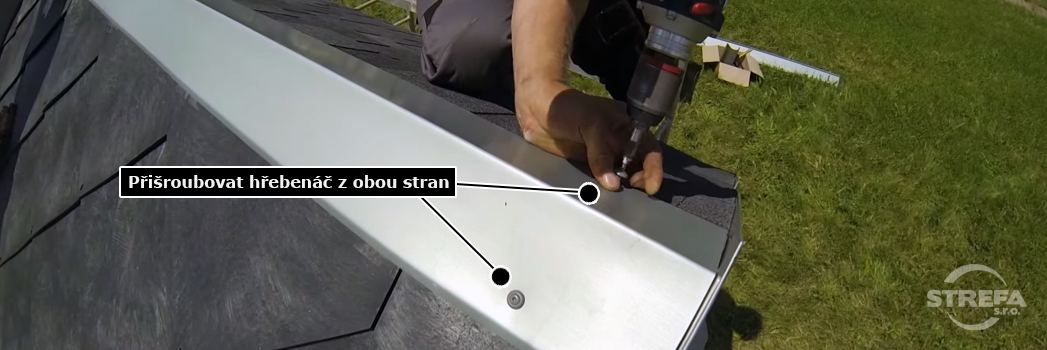 | Grebenjača se izrađuje s unutarnjim kutom cca 110°, ovaj kut je prikladan za sve nagibe krovova jer se može jednostavno prilagoditi na bilo koji kut. Postavljajte grebenjaču od zaštitne letve i to prema vodenoj vagi od najnižeg točke grebena. Grebenjača bi trebala biti toliko široka da prekriva papiroklamere i krajeve krovnog pokrova. Tako postavljena grebenjača možete pričvrstiti na krov. |