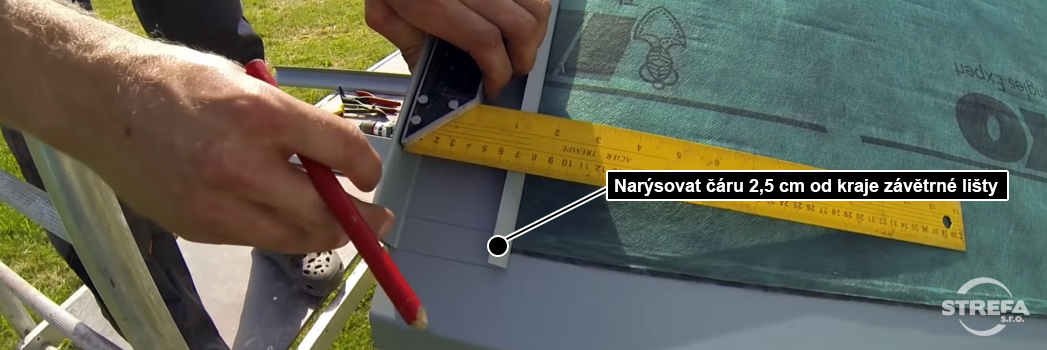 | Prije nego što započnete s montažom same vjetrobranske letve na krov vaše kuće, potrebno je napraviti nekoliko prilagodbi. Prvo nacrtajte na vodoravnom dijelu crticu oko 2,5 cm od ruba vjetrobranske letve. | |